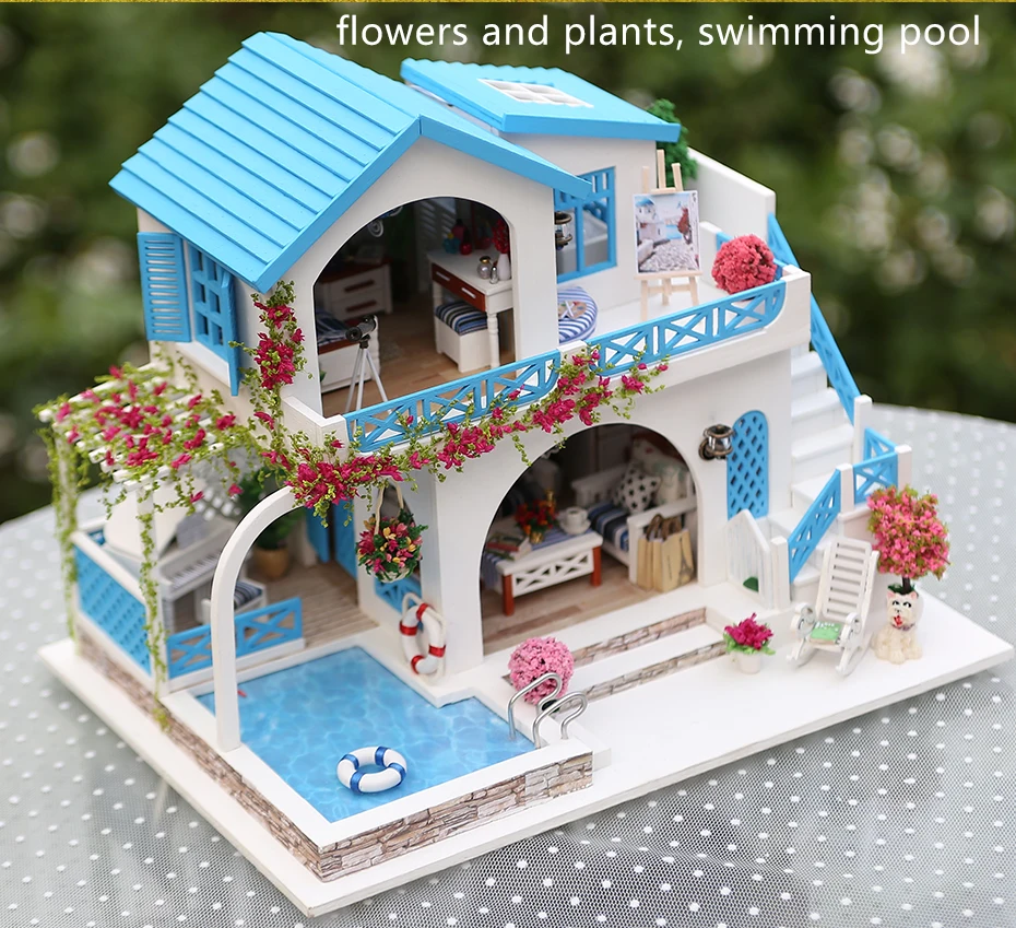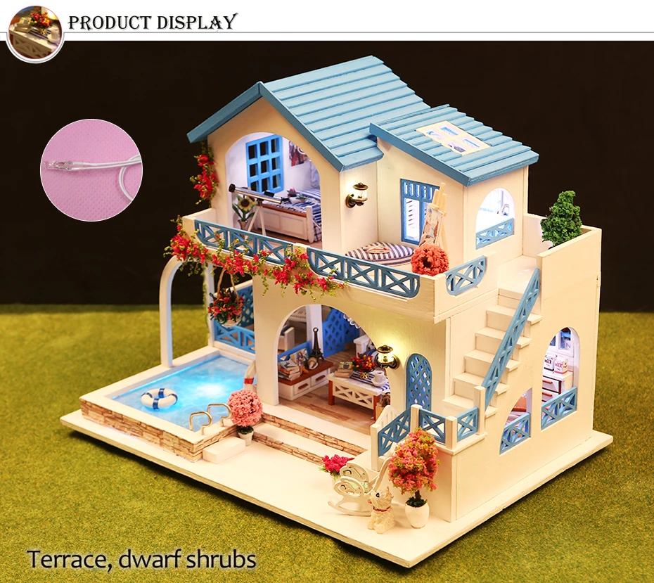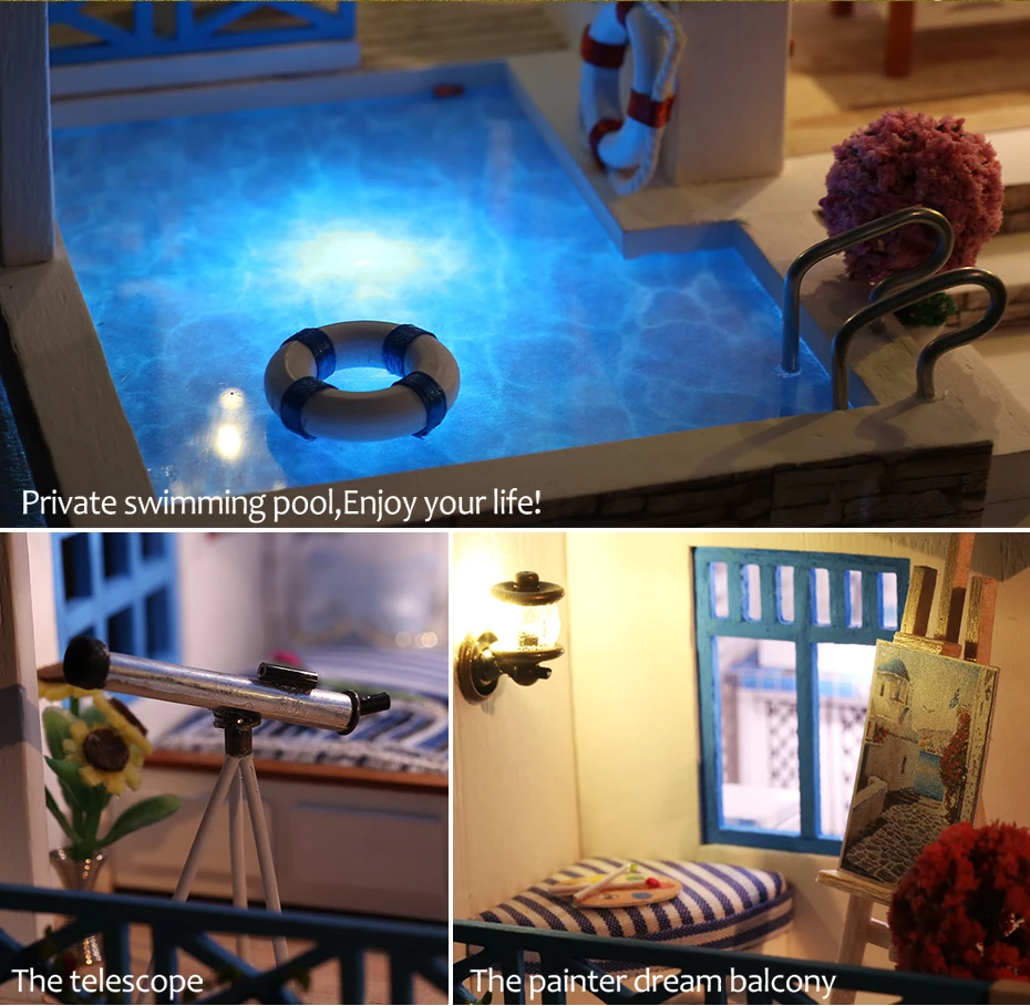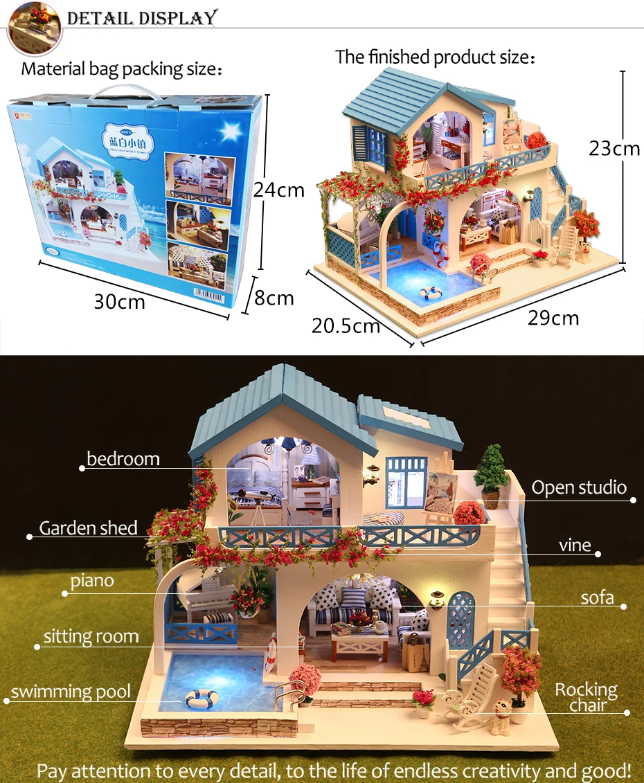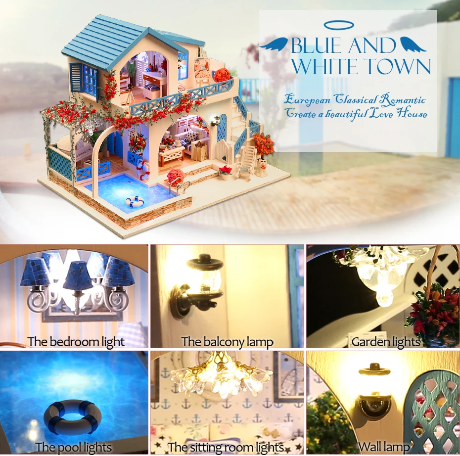 • Miniature Super Mini Size Doll House Building Model Kits Wooden Furniture Toys DIY Dollhouse Blue and White Town